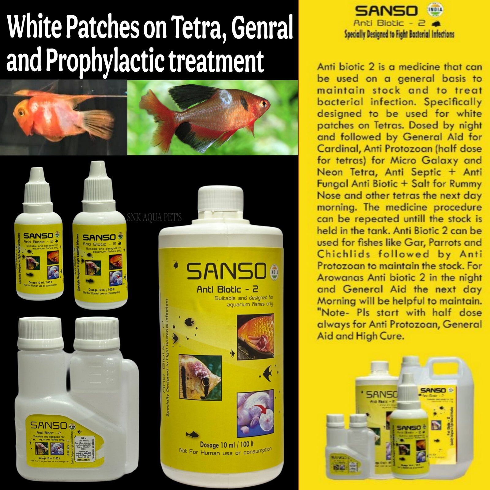 Sanso Antibiotic-2 is a broad-spectrum freshwater antibiotic medication formulated to treat common bacterial infections in aquarium fish. It is highly effective against fin rot, body ulcers, mouth fungus, tail rot, and internal bacterial infections, helping fish recover faster and regain vitality.