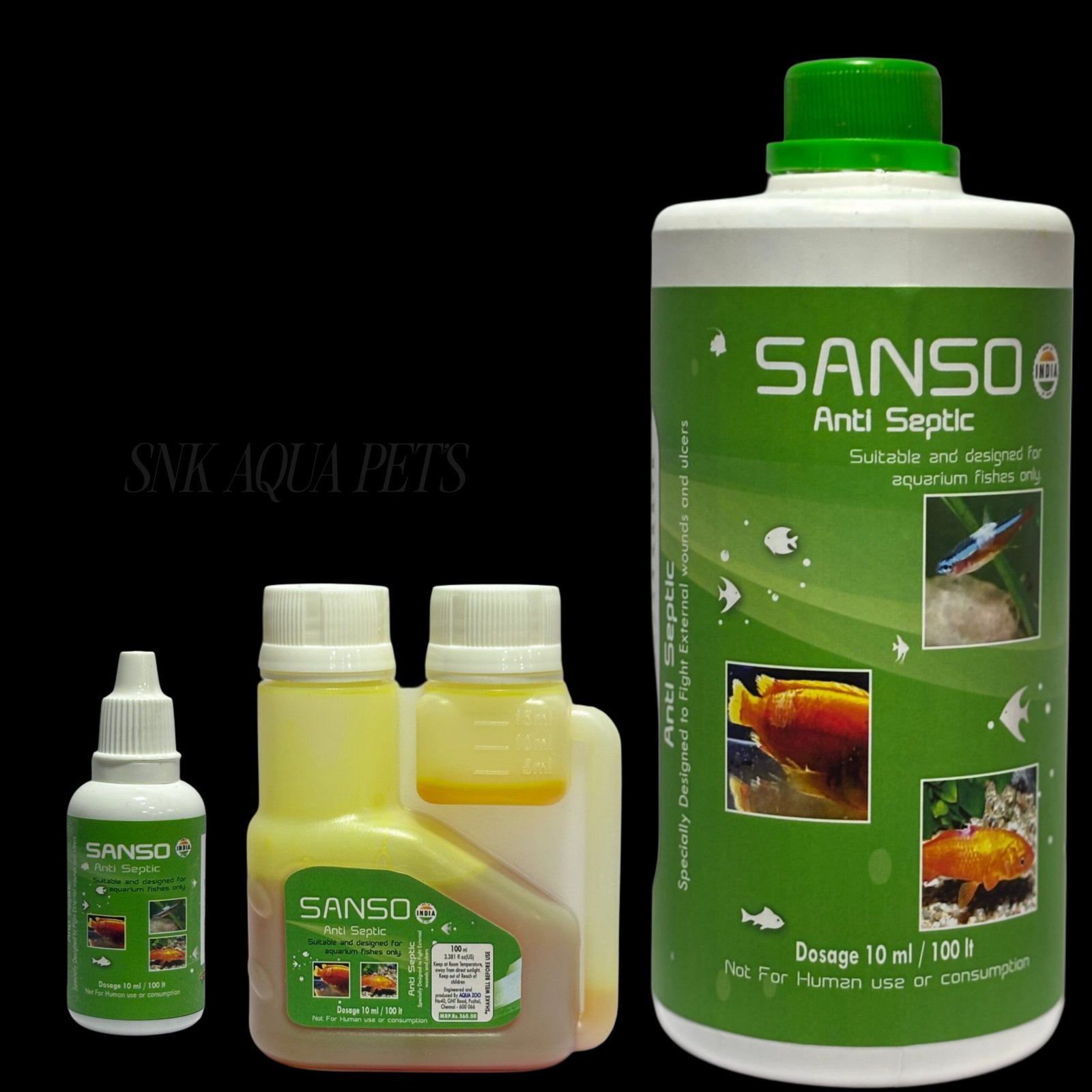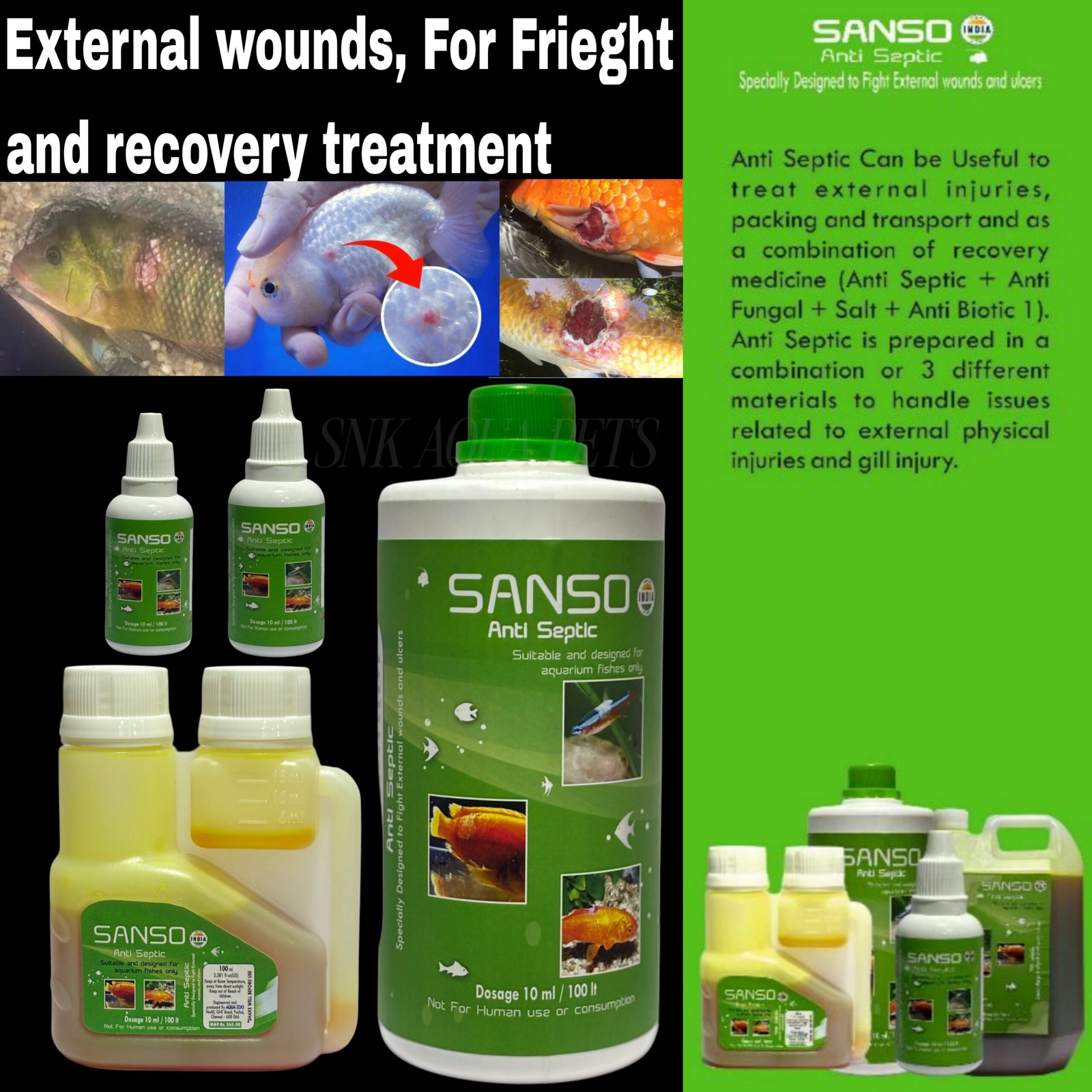 Sanso Antiseptic Medicine is a trusted freshwater fish treatment designed to disinfect wounds, prevent infections, and promote faster healing in aquarium fish. It helps protect fish from secondary bacterial and fungal infections caused by injuries, handling stress, or poor water conditions, ensuring a safer and healthier recovery.