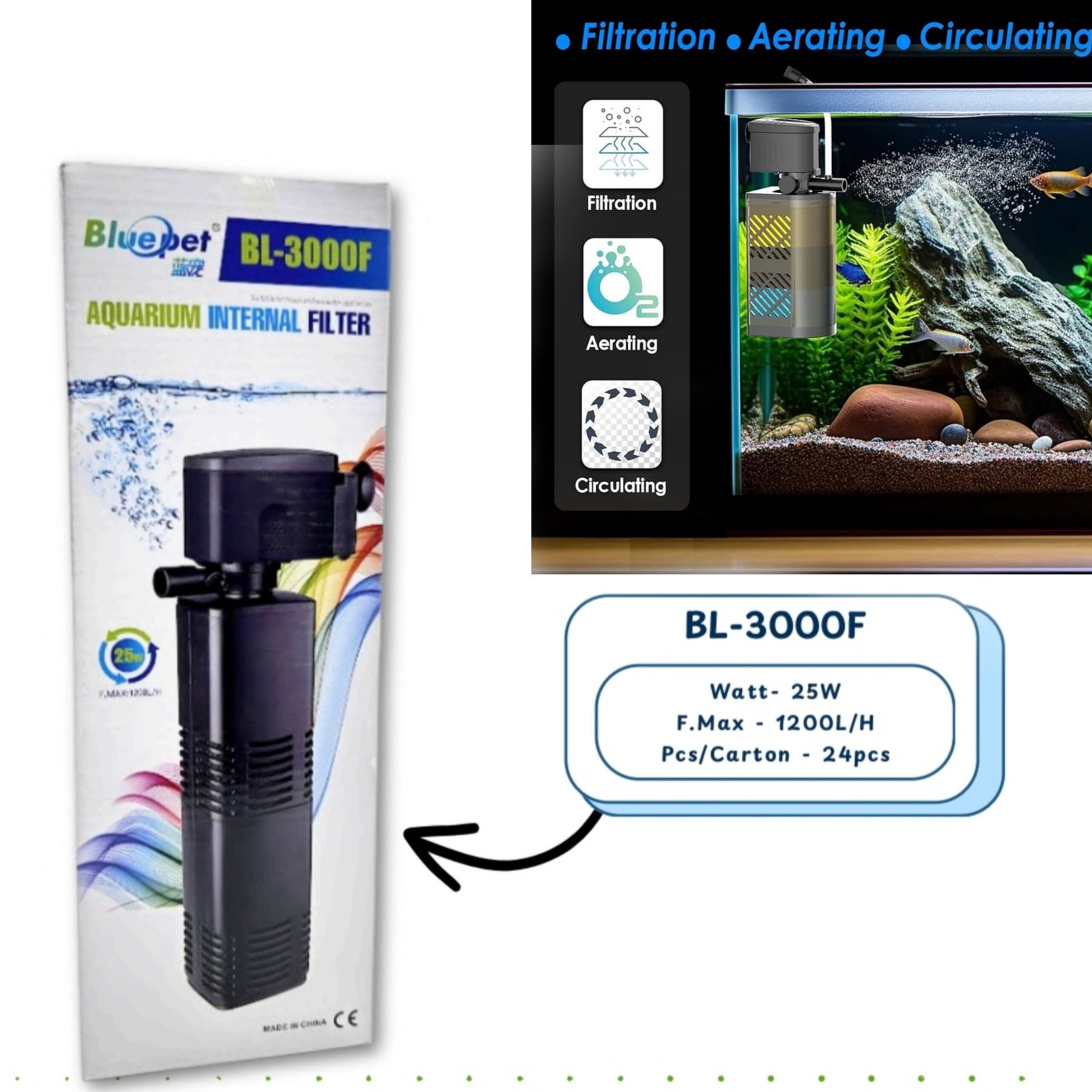 The Blue Pet BL-3000F is a heavy-duty internal filter designed for large aquariums that require powerful water circulation and efficient filtration. With its high-capacity flow rate, it effectively removes impurities, debris, and fish waste while maintaining optimal oxygen levels for a healthy aquatic ecosystem. Built with a durable motor, quiet operation, and easy installation, this filter is perfect for hobbyists and professionals managing bigger tanks.