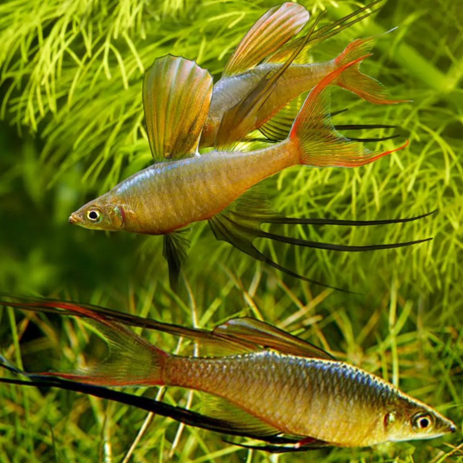 Decor: Dense fine-leaved plants (Java moss, Cabomba, Hornwort) and open swimming areas.