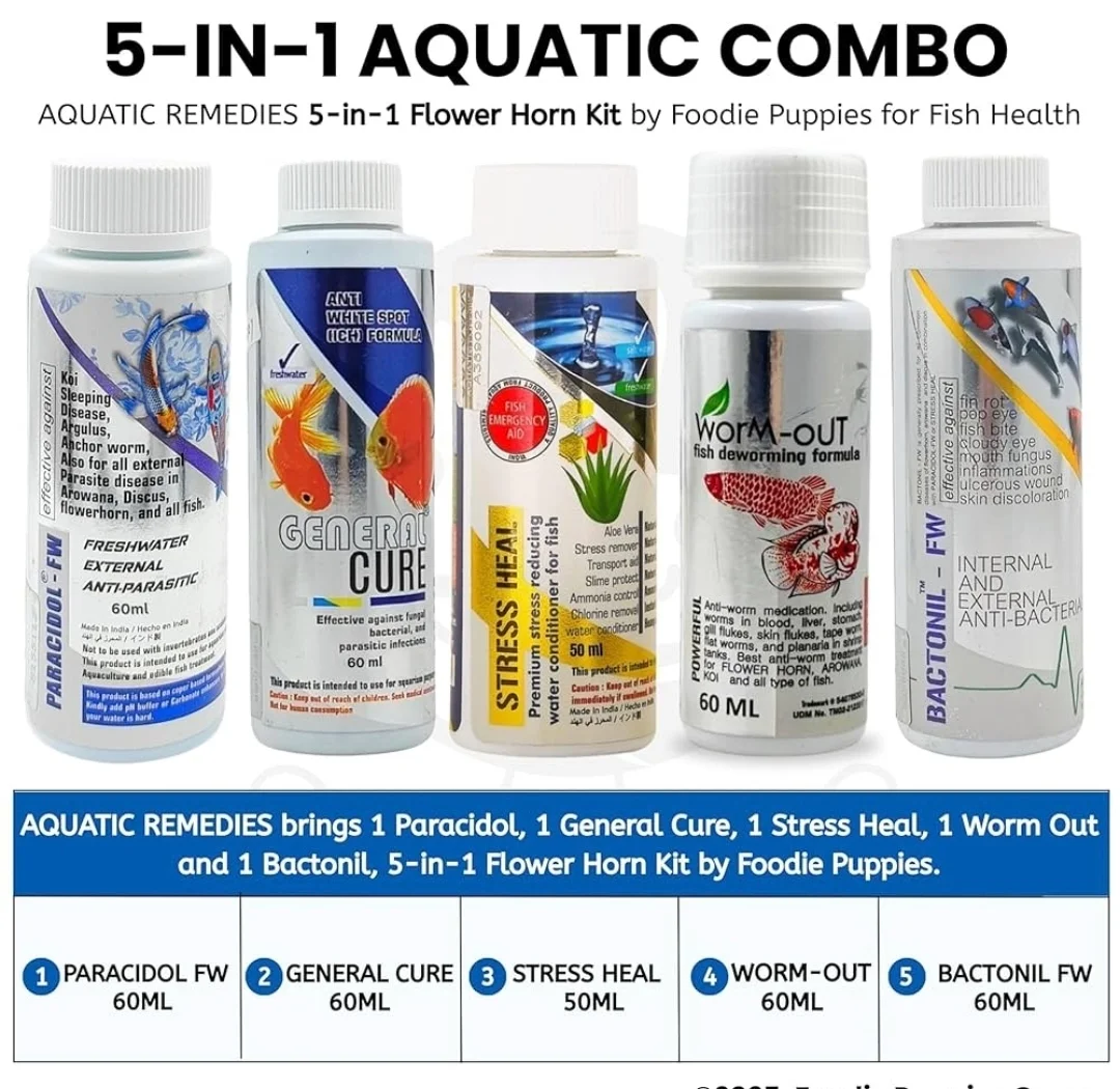The Aquatic Remedies Flowerhorn Total Care is a specialized all-in-one medication and conditioner formulated exclusively for Flowerhorn fish. This complete care pack helps in maintaining vibrant coloration, boosting immunity, preventing common diseases, and enhancing overall health and growth. Designed with the specific needs of Flowerhorns in mind, it ensures that your prized fish thrive in a stress-free environment.