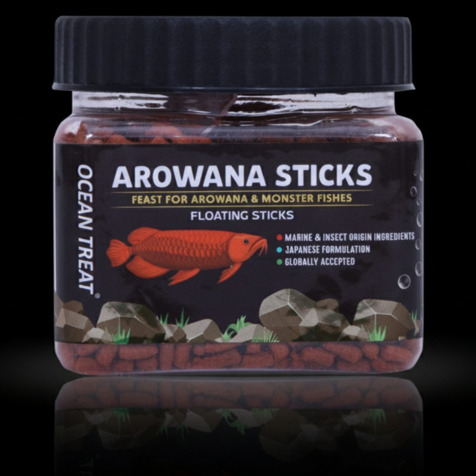 OCEAN TREAT® – AROWANA STICKS, fish food is a premium diet that has been carefully crafted for Arowanas and other Giant fish variants. Made with a unique blend of insect meal and krill meal, this fish food offers a taste that is reminiscent of what these fish would naturally eat in the wild. The worm shaped sticks have an intense flavour that is sure to stimulate the appetite of your fish.