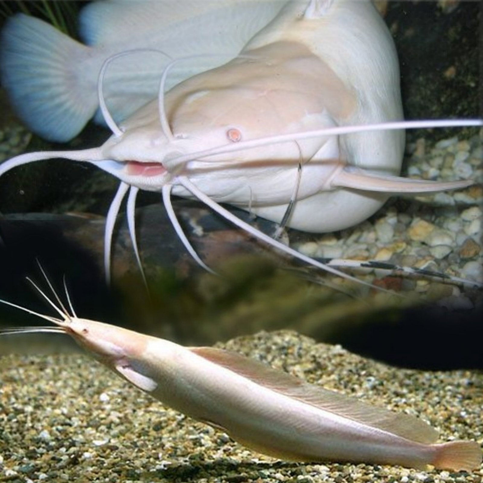 Body: Albino with pale pink to white body, red eyes, and long whiskers (barbels)