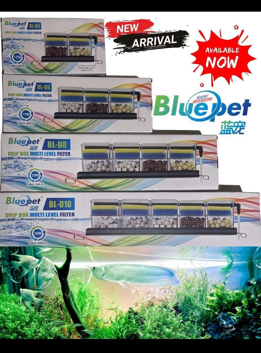 The BLUEPET BL D4 Drip Box Multi Level Filter is a high-efficiency external filtration system designed to deliver superior water clarity for medium to large aquariums. With its multi-layer drip filtration, powerful 12W motor, and included filter media, it offers advanced mechanical, biological, and chemical filtration in one compact, easy-to-maintain unit.