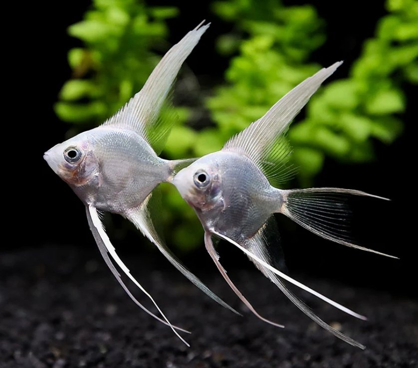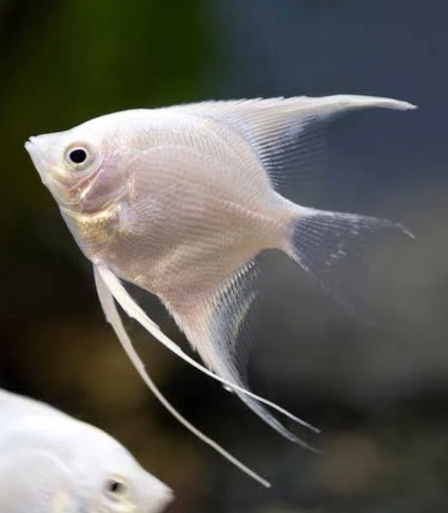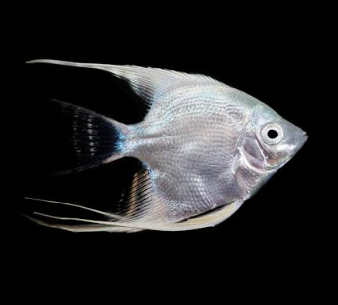 Origin: Selectively bred from wild Pterophyllum scalare found in the Amazon River Basin (Peru, Brazil, and Colombia) — developed for its pure white metallic sheen.
