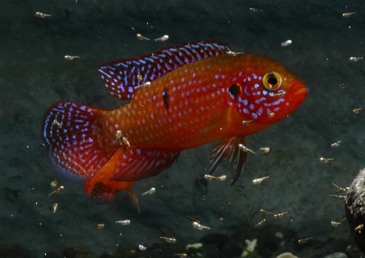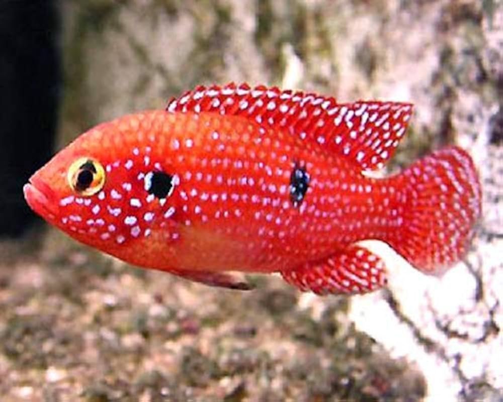 It thrives in well-structured aquariums with rocks and caves, showing off its spectacular red and jewel-like markings.