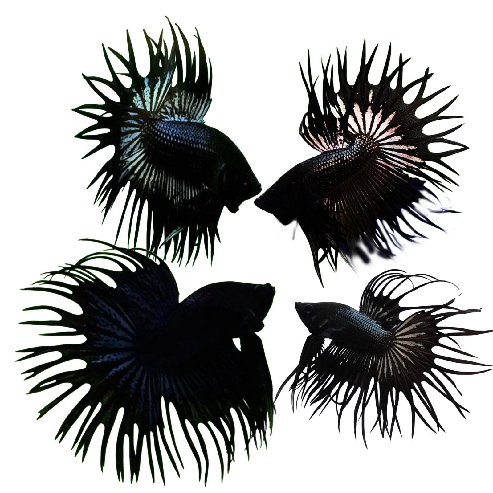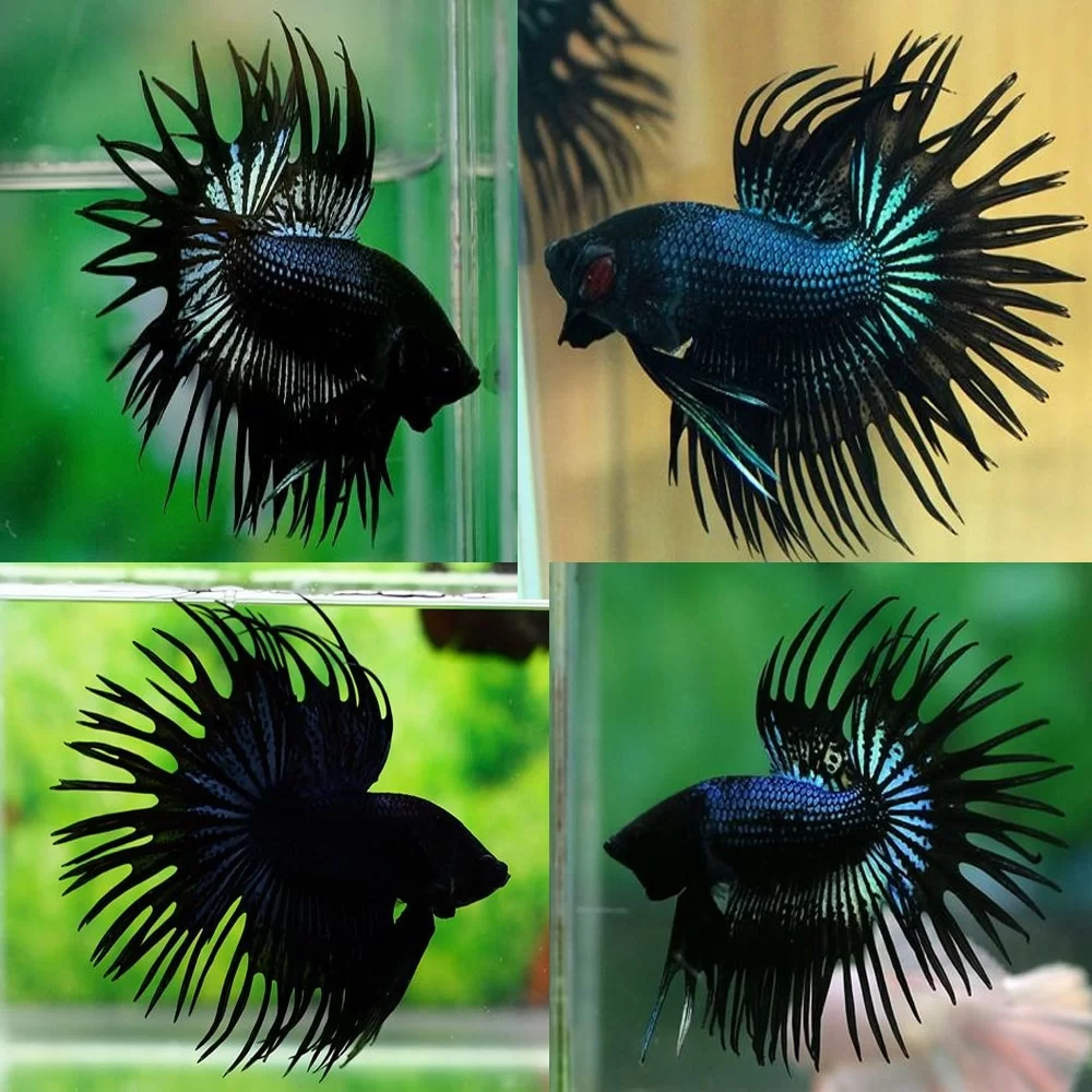 A premium Thai Crowntail Betta known for its striking jet black body and spiky fins.
