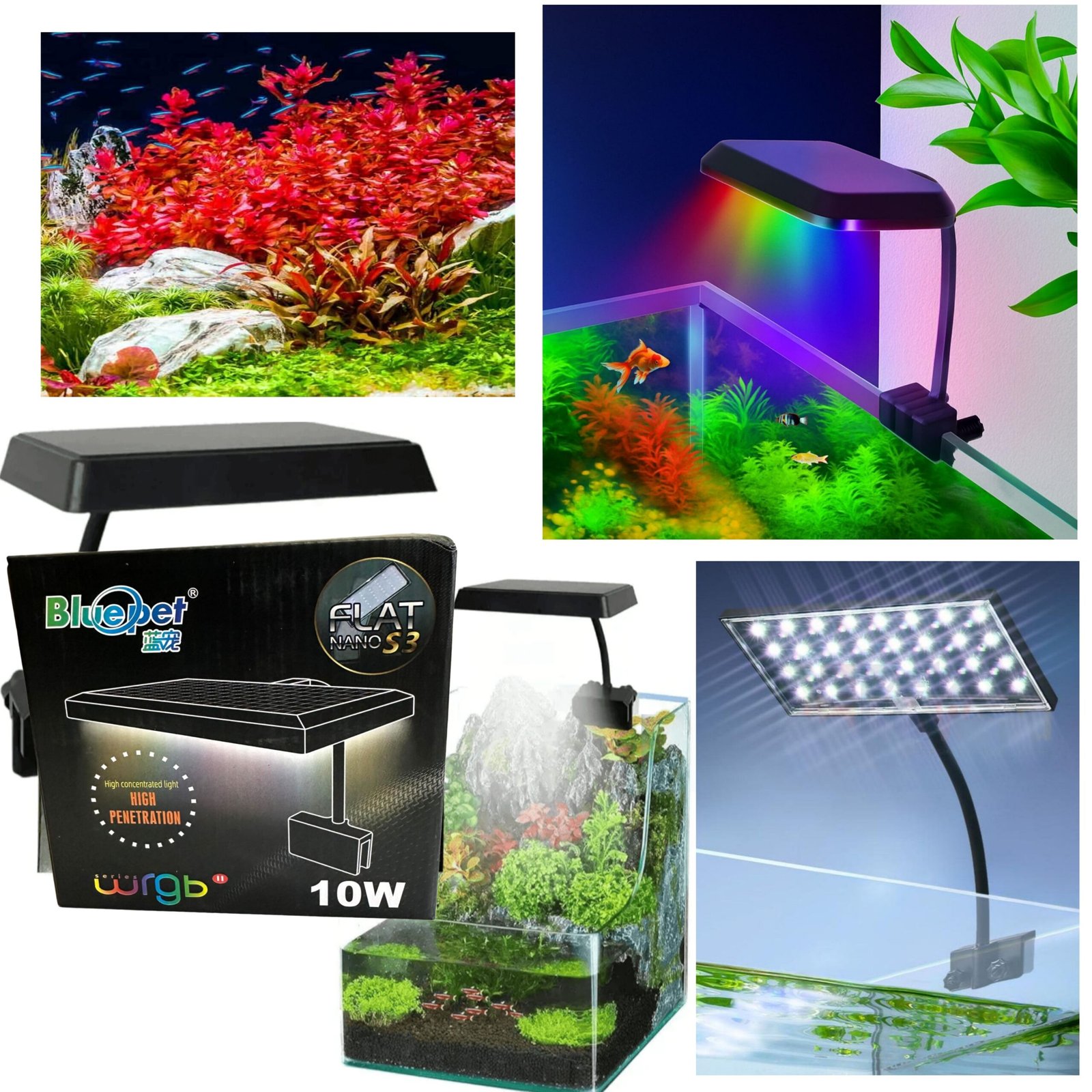 Bluepet WRGB Plantation Lamp S3+ 10W is a compact, full-spectrum LED light designed for planted aquariums. It delivers balanced White, Red, Green, and Blue lighting to enhance plant growth and bring out the vivid natural colors of fish and plants. Ideal for nano and small tanks, it combines high efficiency, stylish design, and strong illumination performance.