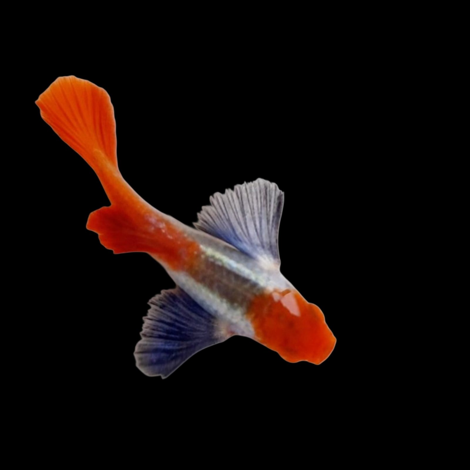 Unique guppy with platinum shine, koi head colors, and dumbo fins.
