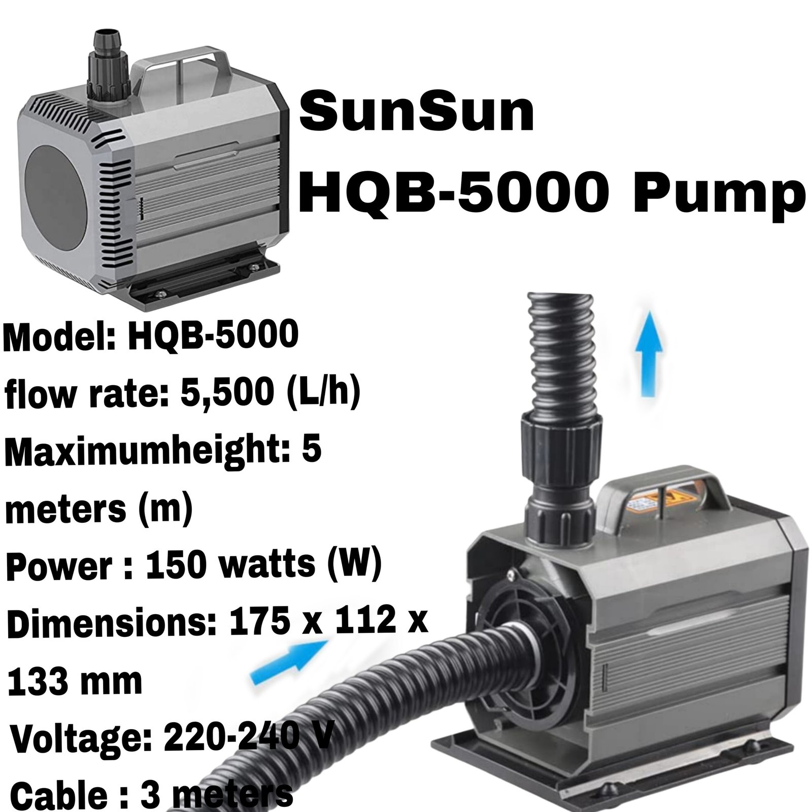 The SunSun HQB-5000 Pump is a reliable, energy-efficient, and quiet solution for very large aquariums, ponds, and hydroponic systems. With its strong water circulation, durable build, and enhanced oxygenation, it ensures a healthy and thriving aquatic environment.