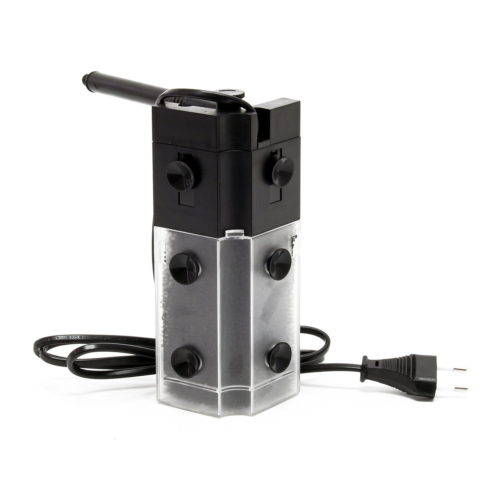 3-in-1 Filtration – Sponge for mechanical, space for biological media, and option for chemical filtration.