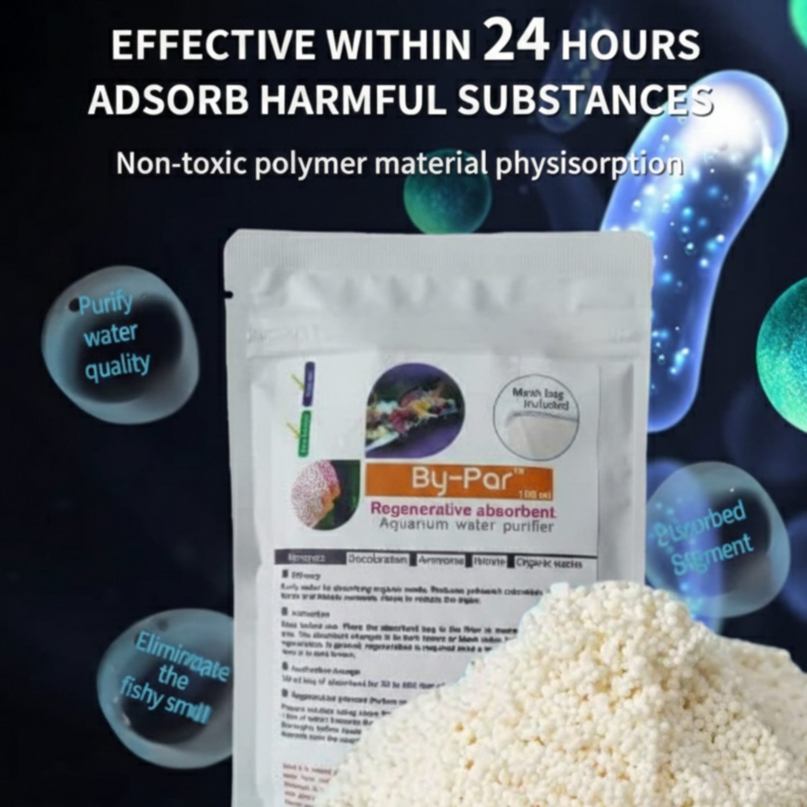 BY PAR is a high-efficiency ion exchange resin designed to absorb and reduce pollutants in both marine and freshwater aquariums. It targets dissolved organic waste, ammonia, nitrite, nitrate, and other harmful compounds that affect water quality. BY PAR keeps aquarium water clean, stable, and pollutant-free, making it ideal for long-term water maintenance and improved fish health.